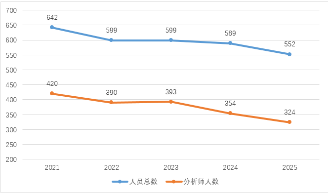 联合资信倡导以人为本的企业文化,吸引了大批有识之士的加盟,近5年来,公司人员数量稳定发展。截止2025年底,公司拥有分析师324人,占公司总人数的59%。
