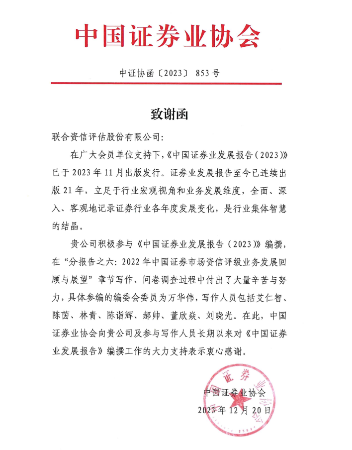 由中国证券业协会组织编撰,联合资信评估股份有限公司(以下简称“联合资信”)参编的《中国证券业发展报告(2023)》于2023年11月出版发行。近日,中国证券业协会专门向联合资信发送了《致谢函》。